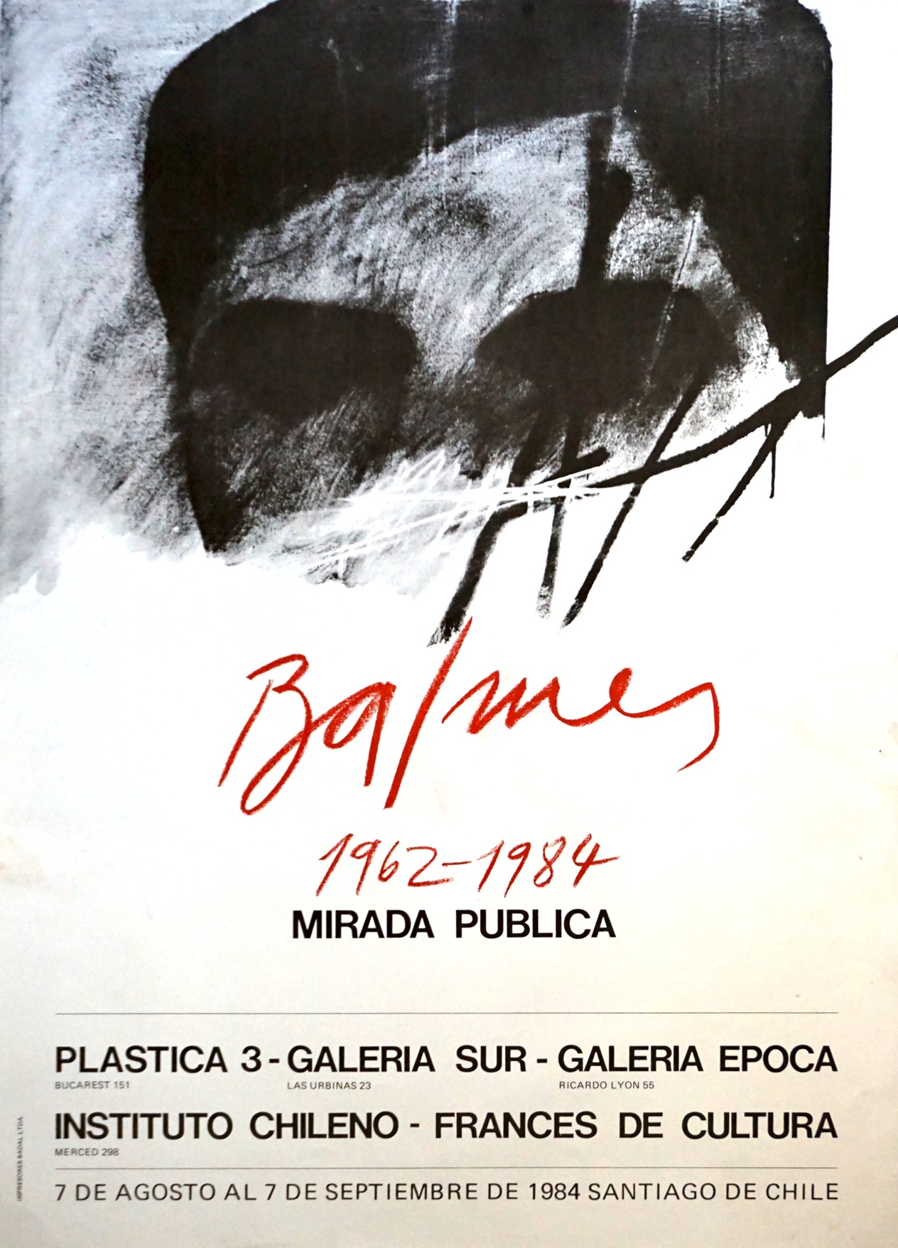 Balmes, José. Mirada Pública 1962-1984. Pinturas - dibujos. Santiago: Galería Plástica Tres, Galería Sur, Galería Época e Instituto Chileno-Francés de Cultura, 1984.