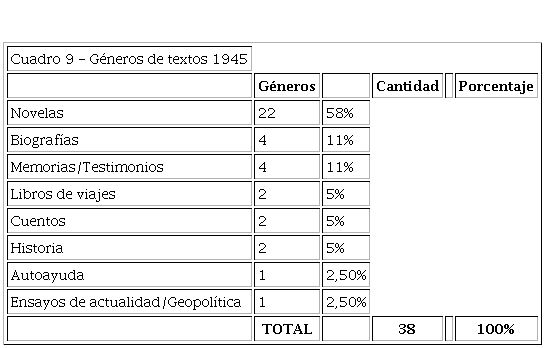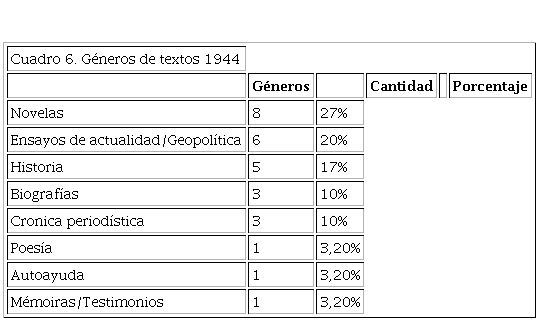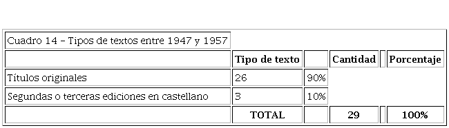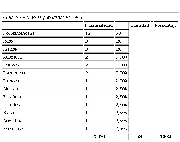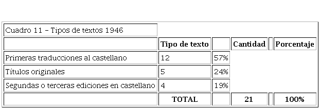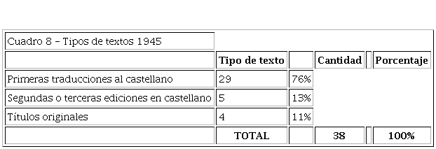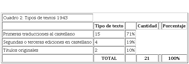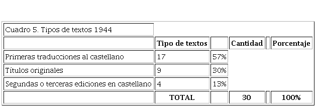 Este predominio de textos escritos originalmente en lengua inglesa se expresa en los resultados del cuadro 2 relativo a los tipos de texto de acuerdo a si corresponden a textos originales o primeras traducciones en castellano, resultando evidente la opción por una estrategia comercial destinada a adquirir los derechos de obras norteamericanas para su primera traducción al castellano, línea que se repetiría en 1944, 1945 y 1946.
