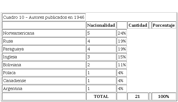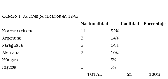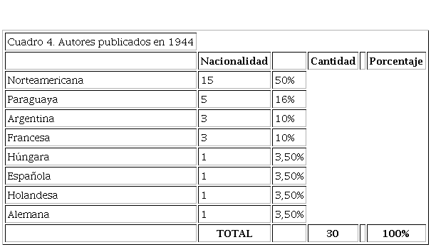 Durante este año creció levemente la producción, llegando a publicarse 30 títulos de unos 26 autores, en donde se mantuvo la hegemonía de los escritores norteamericanos. Así como en 1943, con la inclusión de europeos-norteamericanos, la influencia estadounidense había llegado casi a un 70%, en esta oportunidad, incluyendo al autor alemán y al húngaro27norteamericanizados, el porcentaje alcanzaría un 57%. Sin embargo, esta comienza a disminuir muy levemente en favor de autores paraguayos que en este año finalizaron investigaciones históricas realizadas en los últimos tres o cuatro años que finalmente publicaron.