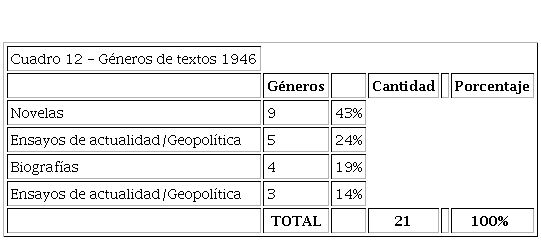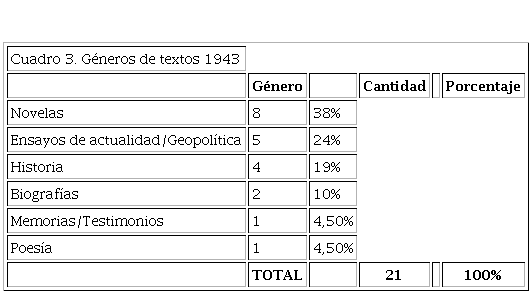 En cuanto a los géneros literarios, se centraron en la novela seguida de los ensayos de actualidad y geopolíticos, revelando una clara dirección hacia el hecho internacional más importante de esos años: la Segunda Guerra Mundial (SGM, 1939-1945). De los 21 títulos que E.A publicó en 1943, 15 de ellos tienen relación directa con la SGM, ya sean novelas, ensayos o biografías, revelando una clara línea editorial pro aliados, pero, fundamentalmente, pro norteamericana. Un aspecto de esto es la decisión de hacer la primera traducción al castellano de libros de autores norteamericanos en los que se basaron para filmar películas recientemente estrenadas y con éxito de público17, cumpliendo con esta característica cuatro de las ocho novelas publicadas.