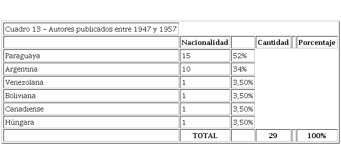 Si hacia 1955 en los catálogos de la Colección Austral de Espasa-Calpe, y en la Biblioteca Contemporánea de Losada se produjo una desespañolización en pos de una latinoamericanización62, en el caso de E.A, a partir de 1947, su catálogo se desnorteamericanizó en pos del mismo fin: la presencia de autores latinoamericanos, en principio paraguayos y argentinos, que luego derivó en una exclusividad paraguaya.
