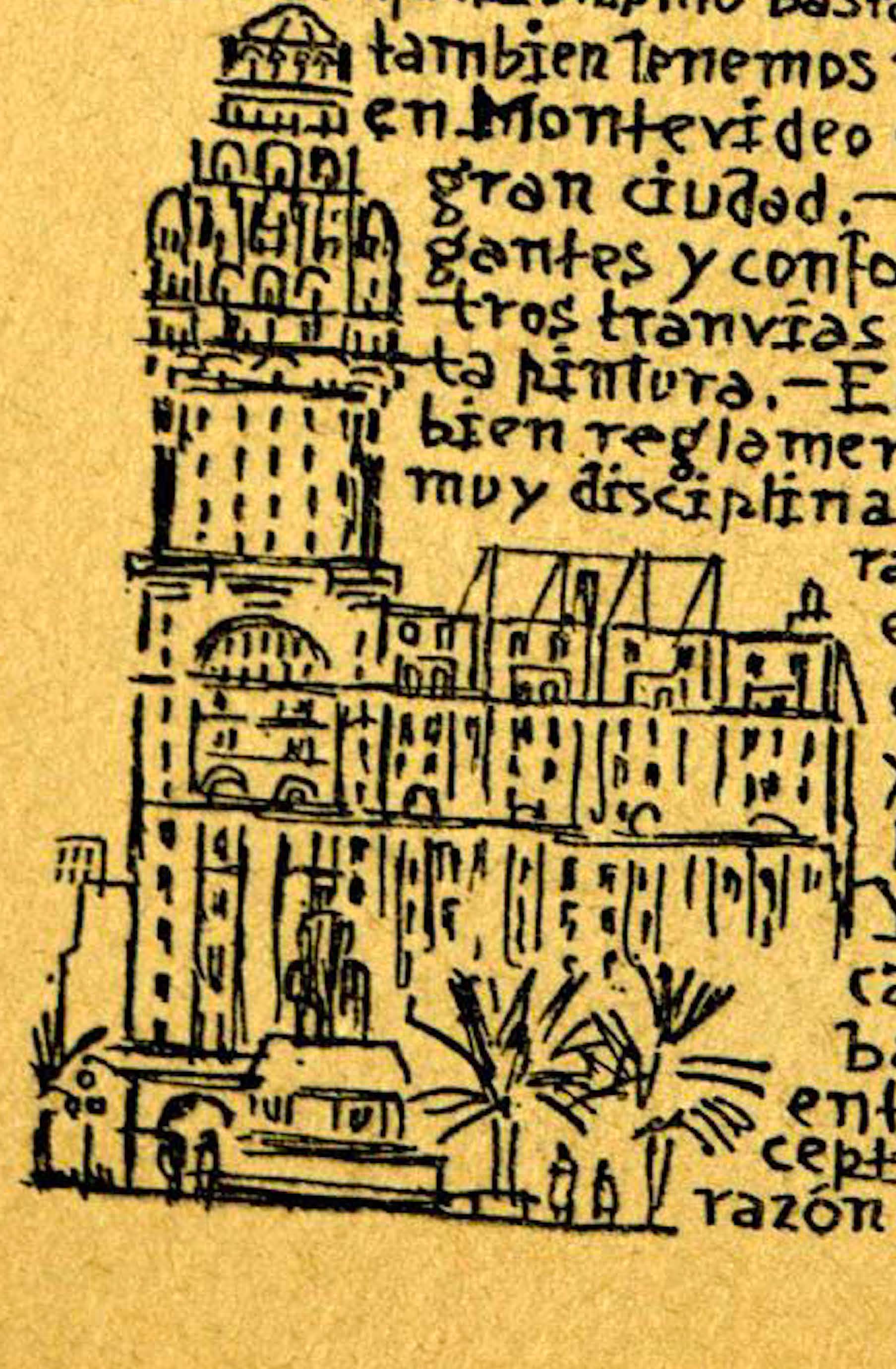 Contar la historia de Montevideo partiendo de La ciudad sin nombre autorizó a Torres García a instalar su propia ciudad en la constelación más amplia de la modernidad. Por ejemplo, cuando integra una imagen del Palacio Salvo (figura 6), de Montevideo, comparable con un rascacielos de Nueva York o en la afinidad de los habitantes europeos con los de la ciudad latinoamericana. Se aprecia así cómo la integración de la escritura y el dibujo apoya la posibilidad de una unicidad plástica, aunque fabricada, de la obra de arte, sin abandonar su objetivo de ser universal. Es decir, hacer el mundo legible para todos. Es lo que él llama, en su texto de 1942 “Calidoscopio” ―presente también en Universalismo Constructivo― como “grafismo”.35