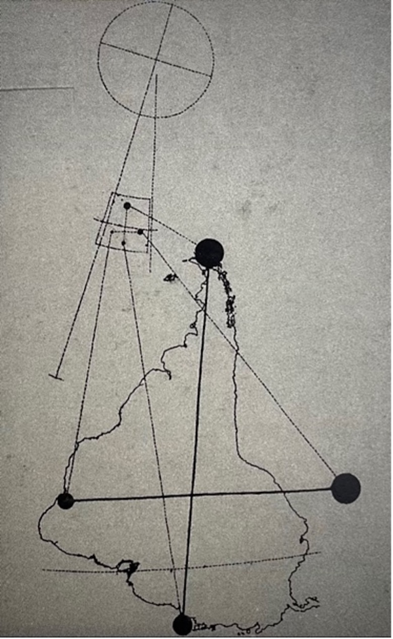 Amereida Idespliega cartas geográficas o estelares que subvierten las convenciones cartográficas. De particular relieve son la inversión del mapa de América (según la “tesis del propio norte”) y la superposición de la Cruz del Sur (constelación guía de los navegantes) sobre la figura del continente. Ambas operaciones buscan desestabilizar las convenciones iconográficas y sus trasfondos políticos y conceptuales, generando nuevas lecturas. El norte propio enlaza con antecedentes como el de Joaquín Torres García: su “porque nuestro norte es el sur… por eso giramos el mapa” (1935) afirma un sistema de referentes autónomo de las dominantes culturas norteñas.42