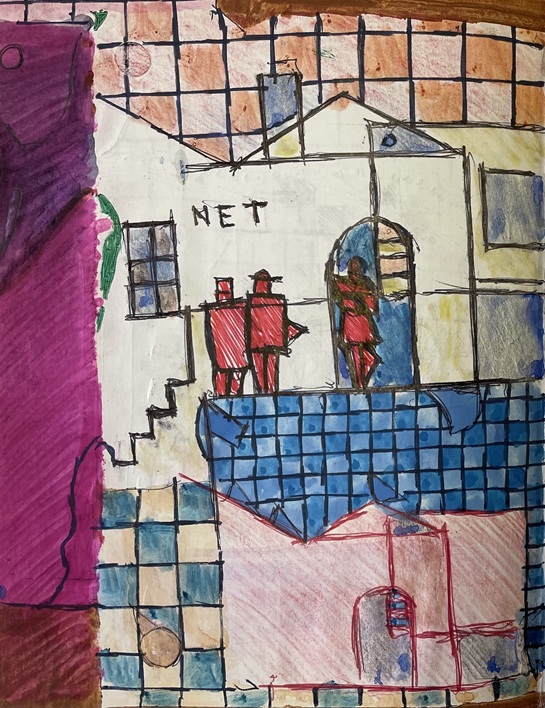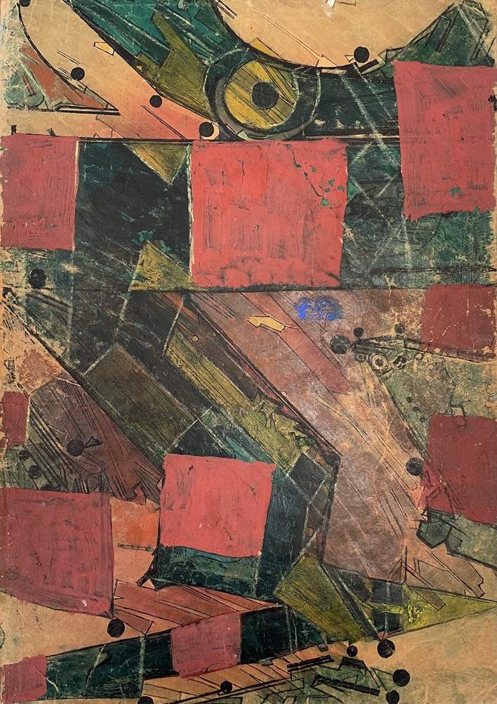 Dentro de ese mismo archivo, en su intensa elaboración visual encontramos un tercer volumen. Se trata de un cuaderno pequeño, de 22cm. x 15cm., circa 1990, con 23 páginas en papel couché con tapas de cartulina y papel bond como forro. No tiene ningún texto explicativo o reflexivo del autor, sólo imágenes. Son dibujos de la serie “Notas de Pintores (NPi)” del archivo de Alberto Cruz Covarrubias, una colección que en total cuenta con dos mil piezas aproximadamente. El cuaderno muestra dibujos coloreados dedicados a la observación de la obra de Joaquín Torres García.