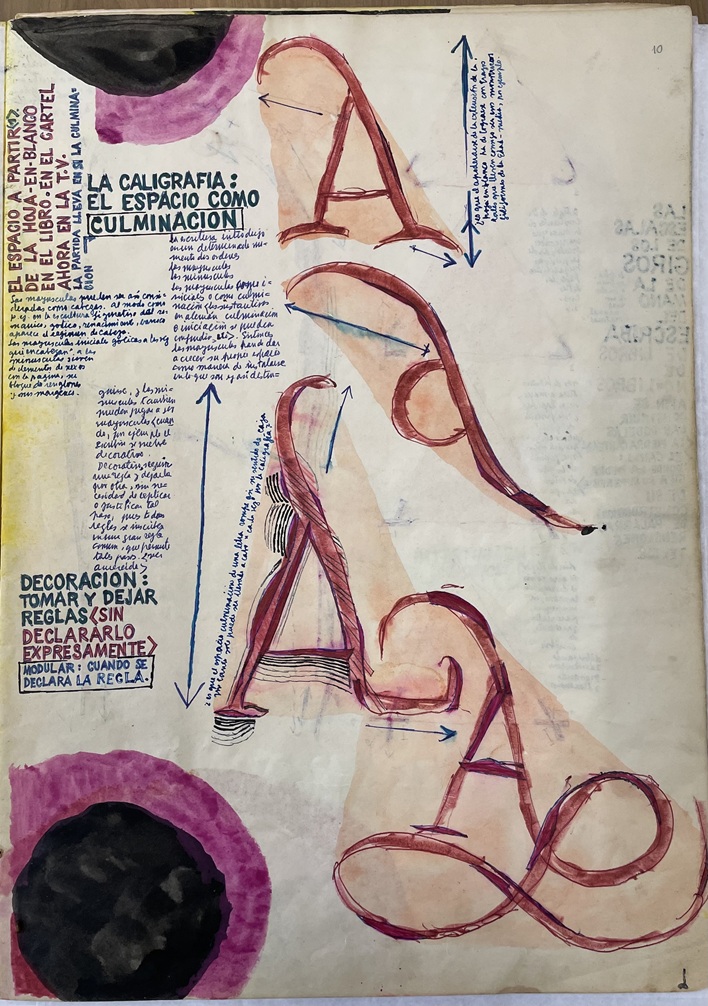 Es esta elaboración entre el dibujo y la letra manuscrita donde Cruz muestra las verdaderas potencias del procedimiento de Torres García. Y nos permite pensar que así como el colectivo de la Escuela de Valparaíso reelaboraba el juego de la inversión del mapa a partir de las Travesías y en Amereida, en una especie de radicalización de la subversión geopolítica ―diríamos incluso postcolonial en los años 60―, en su ejercicio manuscrito y de dibujo Alberto Cruz Covarrubias radicaliza el gesto, no ya hacia una intervención localizada del vanguardismo histórico de Torres García, sino anclado en una posibilidad pedagógica de los principios constructivos del artista uruguayo, o incluso de una política de la pedagogía arquitectónica y urbanística, que vuelve a las latencias de la letra manuscrita.