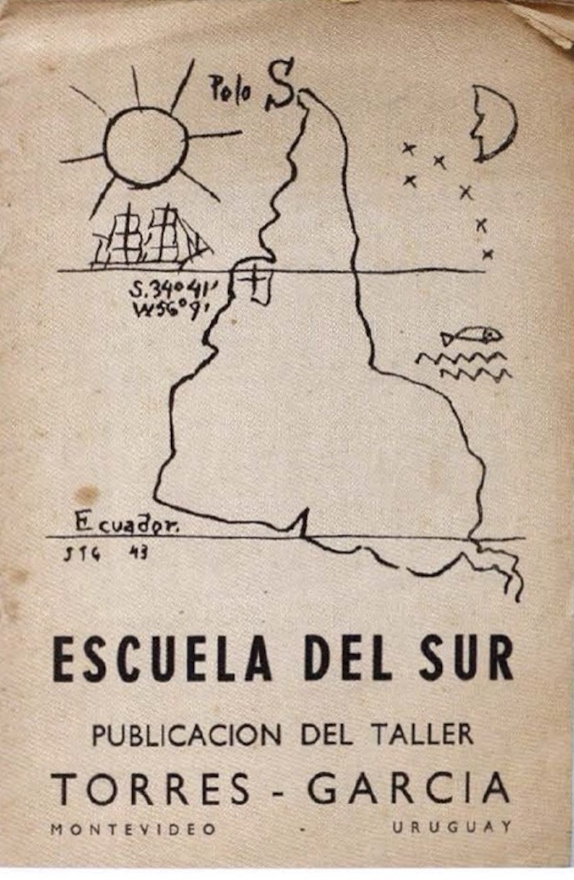 Gran parte de la obra de Torres García escenifica una relación problemática con estos tres significados de la imitación. Muchos de sus cuadros juegan con una cualidad pictográfica, donde figuras esquemáticas, y casi regresivas, se despliegan en una cuadrícula geométrica. Además, es él quien concibió lo que puede ser el ícono de su obra y de gran influencia en otros artistas e intelectuales latinoamericanos como es el mapa invertido de Sudamérica, realizado en 1943, que intentaba subvertir los parámetros espaciales presentes en la lógica del eje Norte-Sur (Figura 1).
