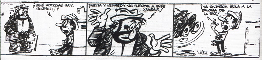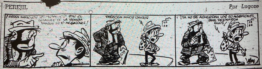 Así, el miedo era un tópico recurrente que quedó de manifiesto, por ejemplo, cuando a Perejil, a finales octubre de 1962, se lo representó corriendo a esconderse en su “refugio atómico” debido a la noticia de barcos rusos [sic] llegando a Cuba en el marco de la crisis de los Misiles. La posibilidad del enfrentamiento directo entre las potencias se convertía en un tema sensible y de alarma pública por motivo de la capacidad destructiva acumulada por cada una.