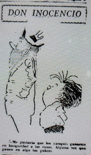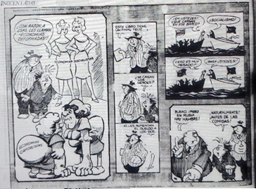 En El Siglo las referencias utilizadas por el personaje Inocencio sobre la URSS carecen de una exageración o ridiculización. En las otras pocas caricaturas de Osvaldo Salas sobre la Unión Soviética, ésta se representa por medio Kruschev o sus cosmonautas. No se encuentran símbolos que hagan referencia o valoren su cultura o ideología. Lo que es más común, especialmente en la viñeta de Inocencio, es la configuración de una superioridad económica y espacial de la Unión Soviética sobre EEUU (figuras 2 y 3) y los intentos por parte de Washington y la prensa afiliada por cambiar esto a través del relato. En la figura 2, con una falsa condescendencia, Inocencio desea que los “yanquis” ganan en basquetbol para que puedan tener algún premio. En la figura 3, El Siglo expone una serie de situaciones comparativas entre socialismo/capitalismo que asocian la belleza, la abundancia y la “liviandad” de la vida con el bloque soviético.