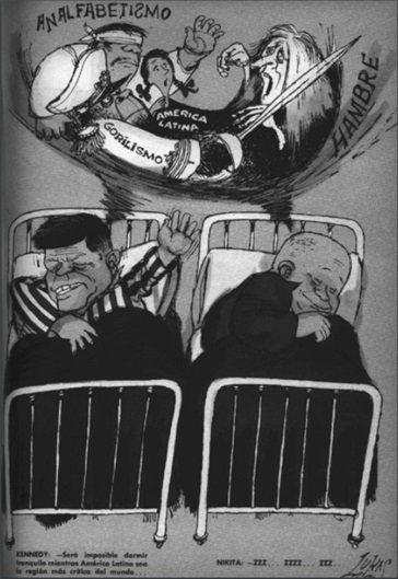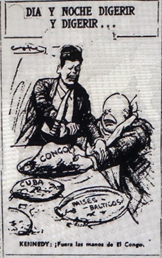 Durante los episodios de mayor tensión de la Guerra Fría, como la Crisis de Berlín (1961) o la Crisis de los Misiles (1962), Kennedy es retratado como alguien que pone freno a la actitud expansionista de Kruschev (Figura n°6). Representa, ante la amenaza comunista o los peligros de la Guerra Fría, una esperanza/protección para el mundo en general y los países de América Latina en particular(figuras 5 y 11). Kennedy aparece como un líder pacifista, ingenuo, que sufre por los problemas del Tercer Mundo y le atribula la carrera armamentista. Físicamente se destaca su figura atractiva y despreocupada (figura 5). Otro de los atributos recurrentes, es la riqueza con la cuenta EEUU o el progreso que genera su modelo económico.
