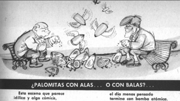 Como pudo apreciarse hasta aquí, tanto la Unión Soviética como Estados Unidos fueron representados gráficamente a partir de un enfrentamiento. En éste, como pasaremos a revisar, destacaron algunos símbolos y acontecimientos como el personaje Mundo, la Paloma de la Paz y la carrera armamentista que, transformadas en herramientas visuales, sirvieron para graficar las oscilaciones entre la guerra y la paz, tan presente en esta tensión.