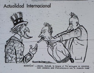 El belicismo, la subordinación de los países satélites y la instrumentalización de las naciones del tercer mundo a través del aprovechamiento del hambre y la miseria son los temas que Topaze ocupa para juzgar a los soviéticos. En la figura 9 significa esto a través del estrangulamiento que Kosygin hace del representante de Checoslovaquia, Alexander Dubček28. La imagen negativa de la URSS, construida en términos de fealdad física, se complementa con una actitud agresiva, amenazante, deshonesta o frustrada por los logros alcanzados por EEUU. Solo en dos ocasiones Topaze refiere a la superioridad espacial de la URSS.