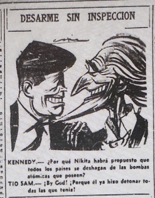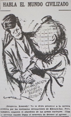 El Diario Ilustrado, con una prosopopeya similar del mundo, colocaba a Kennedy como su defensor. Frente a la reanudación de ensayos de bombas atómicas por parte de la Unión Soviética en 1961 después de un período de tres años y la explosión de la bomba Zar (considerada la de mayor capacidad destructiva hasta entonces detonada), Mundo, compungido, acude al presidente estadounidense y le pide no dejarse arrastrar en la carrera atómica por las “insensatas” acciones de Kruschev. Pero, esto no significaba abandonar la proyección de armamento nuclear, ya que estas servirían, eventualmente, para frenar al “agresor”. El título de la imagen es bastante expresivo: “Habla el mundo civilizado”. De esta forma se subrayaba el bando al que le correspondería la salvación del mundo: el occidental.