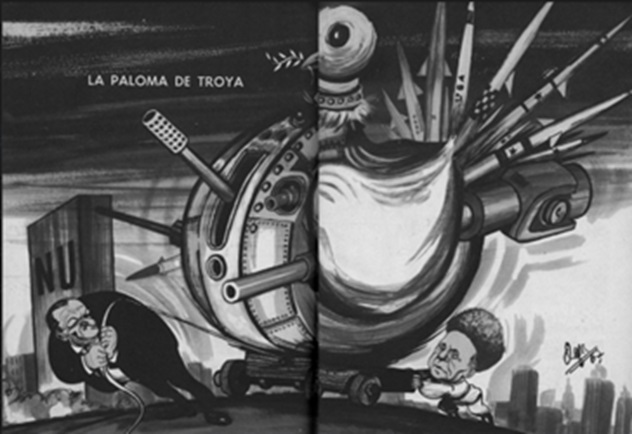 Esta imagen denota una profunda desconfianza ante las negociaciones establecidas entre las potencias; y una connivencia de la Organización de Naciones Unidas, introducida en la imagen por el edificio con la sigla “NU”. La “Paloma de Troya” es la expresión de la suspicacia. La paz puesta sobre la mesa de negociaciones es percibida como una fachada que o bien oculta objetivos bélicos o bien se utiliza para perpetuar el conflicto.