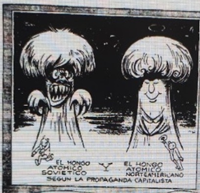 Una mirada políticamente distinta operaba en El Siglo. A finales de octubre de 1961, la Unión Soviética detonó la bomba Zar, hasta hoy la prueba atómica más grande realizada. A propósito de este evento, la Figura 16 hace referencia a la forma en que los discursos “capitalistas” construyeron el relato. A la izquierda, se puede apreciar “el hongo atómico soviético” con clara expresión de hostilidad y amenaza; a la derecha, el “hongo atómico norteamericano” con un gesto de ternura e inocencia. La personificación de las nubes nucleares es una forma de comunicar cómo se estaban dando a entender los eventos. A pesar de que ambos hongos atómicos sean presentados de una magnitud similar, la apreciación de cada uno de los eventos por separado estaría siendo evaluado según el prisma político desde el cual se observaba.