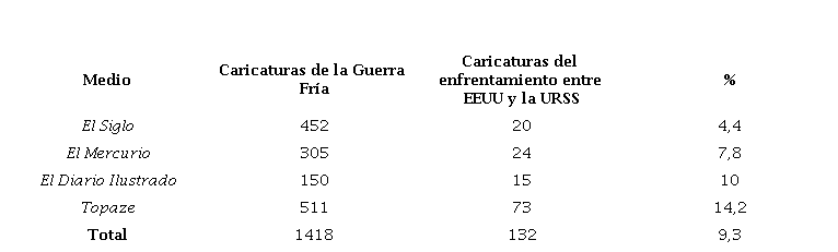 Topaze lidera en la cantidad de caricaturas, seguida de cerca por El Siglo y El Mercurio (Tabla 1). En el caso del El Diario Ilustrado el número baja significativamente debido a que las caricaturas políticas sufren una fuerte discontinuidad a partir de 1962. El mayor porcentaje de caricaturas sobre el enfrentamiento de potencias, vendría a reafirmar la idea de un Topaze mucho menos comprometido con uno de los bandos, a diferencia de los otros medios analizados. En esa línea, El Mercurio y El Siglo parecen evitar el contraste entre potencias, centrando sus publicaciones en criticar a la URSS o Estados Unidos, respectivamente. El Diario Ilustrado, por su parte, ocupa el contraste y se posiciona de manera clara a favor de Estados Unidos y en contra de la URSS, utilizando para ello recursos gráficos mucho más explícitos.