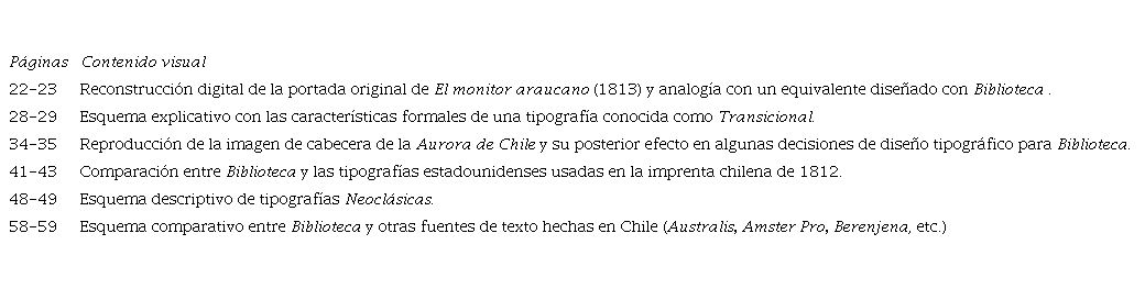 Las fuentes Transicionales, de este modo, inspiran el diseño de Biblioteca. Y el profesor Osses explica en su texto los alcances de este vínculo43. Lo interesante, una vez más, es el modo en el que se expresa este parentesco, o esta relación causa-efecto entre teoría (o historia) y diseño tipográfico. Ya la misma conceptualización de un autor como Robert Brighurst remece en términos metafóricos el trabajo formal al explicarlo como tan “racional” que prescinde del uso de las manos44.