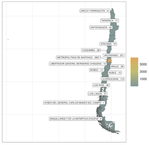 Como se observa en la Figura 1, en términos totales, se visualiza que la mayoría de los registros de publicaciones en ciencias sociales se concentran en la Región Metropolitana, con 3907 registros, de un total 4841 en materia de ciencias sociales, que equivale a un 80,71% del total de inscripciones en el periodo analizado.
