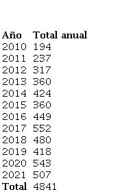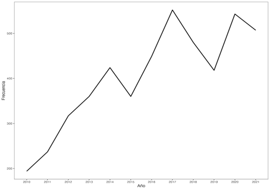 Tras haber realizado cada uno de los procedimientos mencionados precedentemente, se elaboraron análisis de información de carácter descriptivo, en específico frecuencias39 y se construyeron visualizaciones gráficas que permitieron llevar a cabo un análisis comparativo e interpretativo, entre los años 2010 y 2021, de los siguientes aspectos: