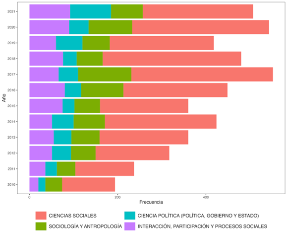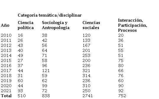 En efecto, una vez estructurado el conjunto de datos, se llevaron a cabo procesos de selección y filtrado, junto con la implementación de técnicas de agrupamiento para procesar la información de manera adecuada, consolidar subcategorías específicas y optimizar la representación de las tendencias a lo largo del tiempo. El registro, por ejemplo, tiene un tema de clasificación general titulado a “Ciencias Sociales”, pero también “Sociología y Antropología”, “Ciencia Política”, entre otras, que se vinculan a estas materias. Se mantuvo sin agregar otros ítems la categoría “Ciencias Sociales”. En el caso de “Sociología y Antropología” se colapsaron dentro de esta otras clasificaciones temáticas vinculadas a estas materias (ej. Sociología Educacional, Antropología Rural, entre otras), lo mismo sucedió para la clasificación “Ciencia Política” (ej. Procesos Políticos, Estado y Gobierno, entre otras), todo esto con el fin de no excluir potenciales registros de ciencias sociales del análisis. Siguiendo este mismo criterio se generó una nueva categoría temática con temas en los cuales resultaba compleja su categorización en alguna de las disciplinas bajo el nombre de “Interacción, Participación y Procesos Sociales”. Como resultado, el total de registros contabilizados bajo las categorías temáticas fue de 4.841 registros.