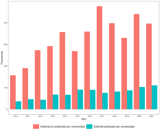 Si bien, era de esperarse que la mayor cantidad de libros de ciencias sociales se concentren en entidades no universitarias, las editoriales universitarias comienzan a posicionarse de manera estable en cantidad de registros en el periodo analizado, pese a los obstáculos que representan el formato paper y la indexación de la cultura académica. Esto asegura un estándar de calidad para los libros académicos que estas entidades deberían promover y su mayor presencia contribuye a la revitalización de la industria. El rol protagónico de editoriales universitarias privadas es un aspecto para considerar en términos de participación, ya que evidencia la consolidación de estas entidades en términos institucionales y el desarrollo de una gestión que les permite sostener iniciativas editoriales propias.45