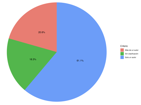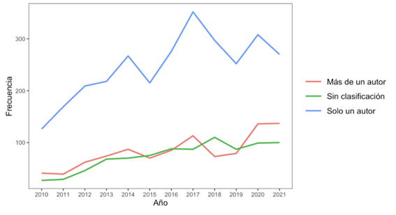 Sobre las características de la autoría de los títulos registrados, la mayoría de las publicaciones en ciencias sociales son realizadas por un autor, consignando un 61,1% (2959 escritos) en el periodo estudiado. En tanto aquellas con más de un autor alcanzan un 20,6% (996 trabajos). Resulta importante destacar que aquellas publicaciones sin clasificación son aquellas que en el registro de ISBN aparecen con nombres institucionales o corporativos, o no se registra un nombre sino que “Varios autores”, representando el caso de 886 de los títulos registrados. Si observamos el Gráfico 5, el comportamiento de las publicaciones con solo un autor sigue una tendencia similar a la del total de libros de ciencias sociales, con su punto más alto, siendo el año 2017. Mientras que los libros con más de una autoría muestran una tendencia al crecimiento sostenida, pero no del todo definida, con su punto más alto, el año 2021. Pese a ser menor la presencia de libros de más de un autor (libros editados o en colaboración), su evolución muestra que cada vez estos libros toman un mayor protagonismo en la industria del libro en materia de ciencias sociales.
