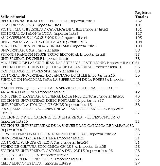 En específico, en la Tabla 4 se visualizan las 30 primeras editoriales que encabezan el número de registros de ISBN en Ciencias Sociales. Aquel sello editorial que ha tenido mayores publicaciones durante el periodo, ocupando el primer lugar en los registros, es Red Internacional del Libro LTDA, conocida también como RIL Editores, que supera con creces el número de registros del segundo sello en la lista, LOM Ediciones S.A. Ambos son sellos surgidos en los años 90 y representan al segmento de la industria del libro reconocidas como editoriales de tamaño pequeño-mediano (también identificadas como editoriales independientes), que en la lista es representado por 11 sellos que están dentro de los 30 primeros con mayor cantidad de registros.