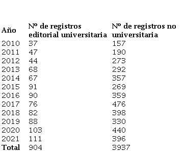 Total de libros publicados de ciencias sociales por editoriales universitarias versus los publicados por editoriales no universitarias.