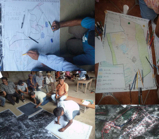 Se realizaron tres mapas participativos de percepción de acuerdo con los tiempos a evaluar: el mapa del pasado en el cual se efectuó un ejercicio de memoria y se reconoció el territorio que las comunidades estudiadas haciendo un repaso histórico de cómo era la comunidad entre los años 1970 y 1980. El mapa del presente donde se trató de reflejar la situación actual del espacio de las comunidades, para hacer una comparación con el mapa del pasado y visualizar los cambios ocurridos hasta el año 2014. Por último, el mapa del futuro tuvo como objetivo representar lo que las comunidades querían cambiar, e inclusive como creen las personas que estarán sus comunidades hasta el año 2030. La información obtenida, se digitalizó en ArcGis 10.0 tomando en cuenta todas las zonificaciones realizadas en el mapeo participativo para los tres tiempos en ambas comunidades, información base que sirvió para el análisis de cobertura y uso de suelo mediante imágenes de satélite.