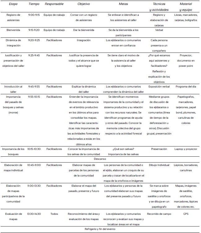 En total se realizaron tres talleres participativos por comunidad con la presencia de los actores locales. El primero fue de inducción sobre la problemática, sensibilización y compromisos entre investigadores y los actores locales. En el segundo taller (Apéndice 1 y Apéndice 2) se consultó a las personas de la comunidad sobre el estado de sus recursos forestales en el pasado, presente y futuro y se construyeron los mapas participativos de percepción. En el último taller se presentaron y validaron los mapas finales con las comunidades (Fig. 2).