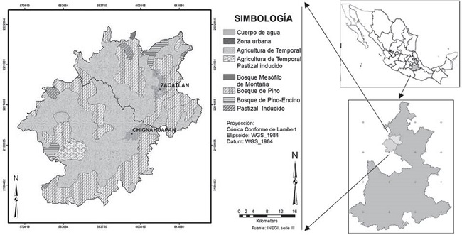 El estudio se realizó en los municipios de Chignahuapan y Zacatlán localizados en el occidente de la Sierra Norte de Puebla (Fig. 1) con una superficie de 124 956 ha (Centro Nacional de Desarrollo Municipal, 1999). Predominan seis tipos de clima, todos catalogados como templados y fríos con humedad clasificada de media y mayor. La zona forma parte del Eje Neovolcánico, con una altitud de 2400 m hasta los 2800 m, en cadenas de cerros bien definidos en el sur y al oriente de la vertiente. Las principales actividades económicas en la zona de estudio son la agricultura y la silvicultura, donde el bosque de coníferas ocupa aproximadamente 43% de la superficie total (Avalos y Baca, 2007).