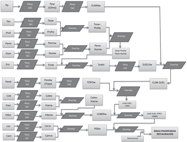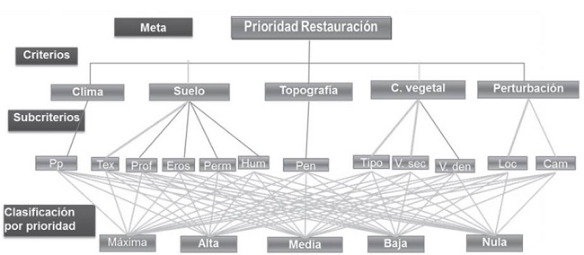 La identificación de áreas prioritarias con necesidad de restauración, se realizó mediante la técnica de evaluación multicriterio denominada Proceso Analítico Jerarquizado desarrollado (PAJ) por Saaty (Gómez y Barredo, 2005). Este método conduce a los tomadores de decisiones a analizar una decisión en partes, iniciando por definir el objetivo principal (jerarquía 1), los criterios (jerarquía 2), los subcriterios (jerarquía 3) y finalizando por las alternativas (jerarquía n), lo que corresponde al primer paso del proceso. Mediante el proceso PAJ se consideraron criterios basados en factores que causan algún tipo de degradación en los ecosistemas los cuáles fueron consensuados por 21 expertos en el tema de restauración mediante una encuesta. Los criterios seleccionados fueron: clima (precipitación), suelo (textura, profundidad, nivel de erosión, permeabilidad y humedad del suelo), topografía (pendiente), cobertura vegetal (uso del suelo, presencia de vegetación secundaria y vegetación densa) y perturbación (cercanía a caminos y localidades) (Fig. 2).