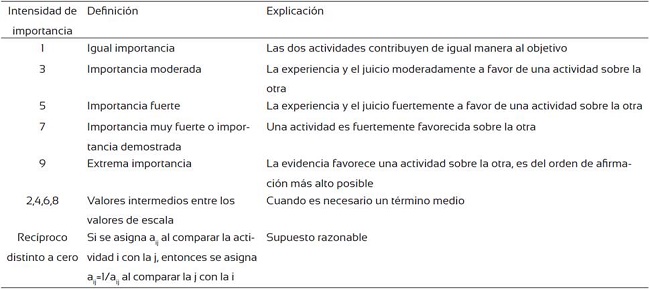 Una vez jerarquizado el problema se utilizan técnicas de comparación pareada dentro de cada jerarquía, con la finalidad de hacer juicios simples a través de la jerarquía utilizando la escala fundamental (Tabla 1), y de esta manera llegar a las prioridades globales de dichas alternativas. En un problema de decisión de tipo espacial, las alternativas son representadas en una base de datos SIG, donde cada capa, o mapa, contiene los valores de los atributos asignados a las alternativas y cada alternativa se relaciona con los atributos del nivel superior (Malczewski, 1999).