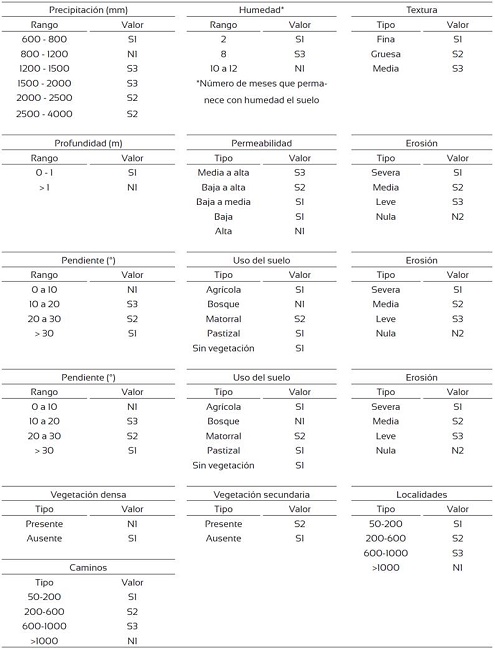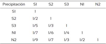 Los mapas de criterios poseen diferentes escalas de medida; el PAJ requiere que los valores de estos sean transformados a unidades comparables para poder correr el modelado cartográfico (Malczewski, 1999). Este procedimiento se realizó estableciendo la prioridad relativa de cada uno de los rangos que comprendía cada criterio, se definieron cinco niveles de prioridad (S1, S2, S3, N1 y N2), donde S1 representa la máxima prioridad y N2 la prioridad nula (Tabla 2). Después de determinada la importancia relativa, se crearon matrices de comparación pareada y mediante el valor máximo (se divide cada valor por el máximo valor), se obtuvieron los valores estandarizados de los subcriterios (Tabla 3).