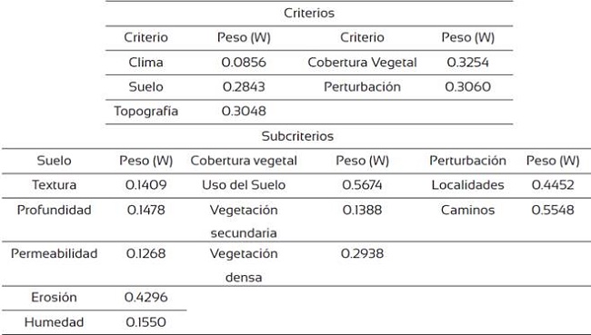 La importancia relativa (W) de los subcriterios, se obtuvo mediante la opinión de 21 expertos en el tema de restauración ecológica de México, España, Paraguay y Venezuela. Los pesos de las matrices construidas por cada experto, así como su consistencia, se calcularon con el módulo Weight del programa IDRISI Selva. Para determinar la importancia relativa (W) de cada criterio se promediaron los resultados de las matrices que resultaron consistentes. La consistencia es el grado de coherencia lógica entre las comparaciones pareadas (Fondo Mexicano para Conservación de la Naturaleza, 2009) y se calculó para asegurar que las respuestas de las matrices fuera lo más objetiva posible, valores de consistencia menores o igual a 0.10 son considerados aceptables (Gómez y Barredo, 2005).