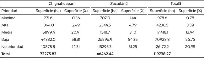 La prioridad de restauración dominante es la prioridad baja (56%) y se encuentra principalmente en las áreas boscosas destinadas a la silvicultura (Fig. 4). En segundo lugar, las áreas sin prioridad que ocupan 21% de la superficie (Tabla 5) con presencia de vegetación boscosa densa. En ambas categorías se concentran aproximadamente tres cuartas partes de la superficie de la región Chignahuapan-Zacatlán.