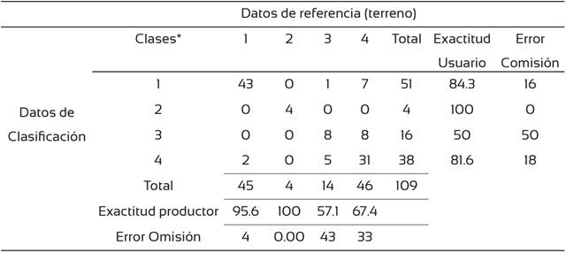 La validez de la clasificación se realizó mediante una "matriz de confusión", de la cual se obtuvo la fiabilidad global de la imagen clasificada y el índice Kappa (Chuvieco, 2008). La verificación en campo, se llevó a cabo bajo un diseño aleatorio simple con 110 puntos de muestreo, aproximadamente 27 por clase temática. Con la clase temática determinada como bosque, se realizó un mapa booleano y se eliminaron las áreas con algún tipo de perturbación, como las áreas bajo algún tipo de aprovechamiento y zonas donde hay trabajos de conservación y restauración de suelos. La información se obtuvo de la Comisión Nacional Forestal (2010, 2011 y 2012), quedando presumiblemente las áreas con vegetación con menor perturbación mediante álgebra de mapas.
