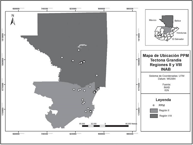 El área de estudio corresponde a las regiones forestales II y VIII, de acuerdo con la clasificación del Instituto Nacional de Bosques de Guatemala (INAB) (Fig. 1) y corresponde a la llamada "Área septentrional" de la República de Guatemala. Las regiones comprenden los departamentos de Alta y Baja Verapaz (región II) y El Petén (Región VIII). La figura 1 muestra la ubicación de cada región forestal en relación con el resto de la República de Guatemala y los países vecinos: México -al norte y Oeste-, El Salvador y Honduras -al Este- y Belice -al Noreste-; asimismo rodeada por los océanos, Pacífico -al Sur- y Atlántico -al Noreste-.