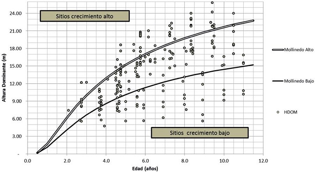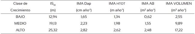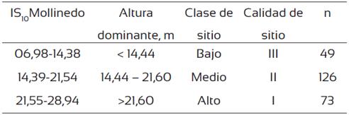 A partir de este análisis, fue posible obtener los valores correspondientes para cada clase de sitio a la edad base de 10 años, que se muestra en la Tabla 2.