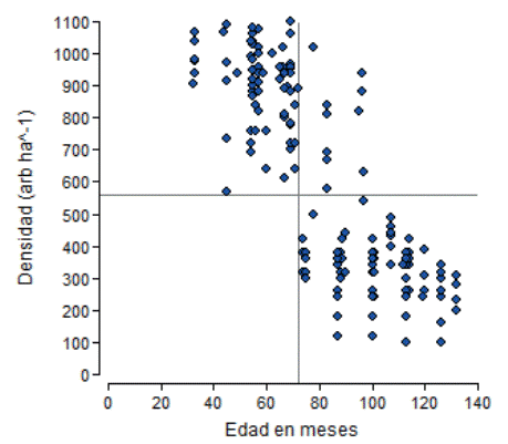 El análisis de los valores en las variables de las PPM, permitió encontrar que las plantaciones sufrieron un raleo equivalente a un promedio de 53% de su densidad inicial, a la edad aproximada de 72 meses (6 años), reduciendo la misma desde un promedio de 1,111 árboles por hectárea (establecidas a un distanciamiento de 3m x 3m), hasta un límite inferior de aproximadamente 570 árboles por hectárea. Sin embargo, y cuando se analiza este primer grupo, se encontró que las plantaciones tuvieron una reducción en su densidad aproximadamente a los 44 meses o 3,5 años. El espaciamiento inicial y el primer raleo son las más importantes decisiones en una rotación, porque definen a lo largo del tiempo el curso y flexibilidad de las operaciones subsecuentes que son críticas para el mantenimiento y el vigor y crecimiento del rodal (Pérez 2005).