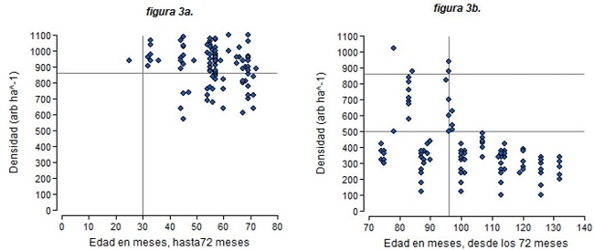Esta reducción en la densidad de árboles se debió a la aplicación de raleos sistemáticos, en el mejor de los casos obedeciendo la prescripción silvicultural de la especie aprobada por la institución (INAB). Sin embargo, cuando se analiza la Figura 3a respecto a una edad límite de 72 meses o 6 años (izquierda), la situación muestra que a los 30 meses (2,5 años) ya se había realizado un primer raleo (equivalente a aproximadamente 7,74%), reduciendo la densidad desde un aproximado de 1111 árboles por hectárea hasta un aproximado de entre 860 árboles por hectárea hasta un aproximado de 600 árboles por hectárea.