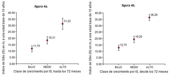 En el caso de los sitios con edades desde los 72 meses (Fig. 4b.), los sitios bajos alcanzarán un IS con 12,75 m. Sin embargo, los sitios clasificados como de crecimiento medio, lo harán con 19,20 m y los sitios de crecimiento alto con 36,29 m. En estas condiciones, también, existen diferencias estadísticamente significativas entre el IS y las clases de crecimiento de cada sitio a (p = 0,001).