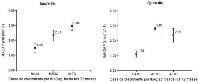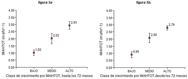El análisis por separado (hasta los 72 meses y desde los 72 meses) permitió encontrar una heterogeneidad en el crecimiento, manifestado más en el IMADap, IMAAB y elIMAVol, al encontrar valores más altos en sitios hasta los 72 meses y en el caso de sitios desde los 72 meses, los sitios medios superan a los sitios altos.