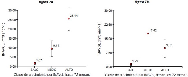 Los resultados del incremento medio anual en volumen (IMAVol), en sitios hasta 72 meses de edad (Fig. 7a), son los siguientes: los sitios con crecimiento bajo alcanzaron 1,67 m3 año-1, mientras que los sitios de crecimiento medio lograron acumular 9,44 m3 año-1, entre tanto, los sitios de crecimiento alto pudieron acumular cantidades mayores a 25,44 m3 año-1. Entre esta variable (IMAVol) y las clases de crecimiento por productividad, existen diferencias estadísticamente significativas a (p= 0,001). Lo contrario se da en los sitios desde los 72 meses de edad (Fig. 7b), donde siempre los sitios bajos alcanzaron un IMAVol de 1,29 m3 año-1, sin embargo, los sitios medios superaron inclusive a los sitios altos, con valores de 17,62 m3 año-1 por encima de los 9,83 m3 año-1, respectivamente.