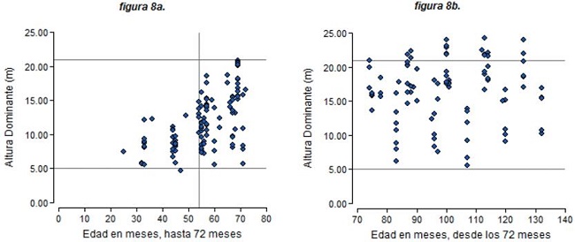 Lo que dejan ambos hallazgos es que en la Figura 8a, ya existían sitios de crecimiento alto antes de los 72 meses, en mayor proporción que la Figura 8b, después de los 72 meses; detectable en los sitios donde la altura dominante supere los 15 m. Es decir, se asume que no se eliminaron árboles dominantes durante los raleos, por consiguiente, las condiciones de sitio serían las que explicarían este comportamiento.