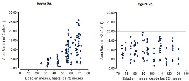 Con esto se evidencia que en algunos sitios las plantaciones respondieron muy bien a un raleo practicado durante ese periodo. Sin embargo, el análisis por separado de los grupos por edades (ver Fig. 9a), hasta 72 meses y desde los 72 meses (Fig. 9b), indica que sólo algunos sitios pueden alcanzar hasta 20 m2 ha-1 año-1. Sin embargo, en los sitios desde los 72 meses, apenas algunos sitios alcanzaron hasta 20 m2 ha-1 año-1, valor que se ubica similar a los sitios hasta 72 meses, lo cual indica una buena baja respuesta de la planta al raleo sistemático. Este desorden en el crecimiento y desarrollo, puede deberse precisamente a que los sitios no fueron previamente analizados en términos de un estudio detallado de suelos, y lo que en un principio debía basarse en prescripciones definidas para especie en un sitio determinado fue hecho de manera arbitraria, sin una base técnica-científica apoyada, en el mejor de los casos, en un monitoreo del crecimiento de las plantaciones. En ambas figuras, los sitios con crecimientos altos alcanzaron áreas basales > a 20 m2 ha-1 de los 55 a los 72 meses y de ahí ningún otro sitio lo logró a ninguna otra edad a lo largo de casi 12 años.