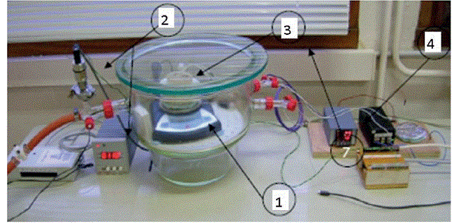 Le dispositif expérimental (Fig. 1) est une chambre à vide où la pression est réglée entre deux valeurs : Pmin (6 kPa ; 60 mBar) et Pmax (10 kPa ; 100 mBar). Le chauffage provient d'une résistance noyée dans une plaque d'aluminium afin d'homogénéiser la distribution de la chaleur dans la zone de contact. Les capteurs de température ont été placés à trois emplacements suivant l'épaisseur du disque de bois. Un de ces capteurs a été placé à 3 mm à proximité de la plaque, un autre au centre du disque et le troisième à 3 mm en dessous de la surface d'évaporation. Pour chaque expérience, l'historique des trois températures est enregistré.