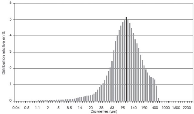 Les Spectres Infrarouge à Transformée de Fourier des échantillons de bois ont été obtenus avec un spectromètre Bruker EQUINOX 55 (Bruker Optics Inc, Ettlingen, Allemagne), sur la gamme 400 cm-1-4000 cm-1 et une résolution de 4 cm-1, les spectres sont enregistrés selon le mode de réflexion (R%). Dans un souci d'homogénéisation des échantillons de poudre de bois, nous avons passé les sciures du bois destinées à l'analyse FT-IR dans un tamis à 100 micromètres. Une analyse granulométrique par diffraction laser a été pratiquée en utilisant l'éthanol comme liquide porteur. La distribution relative des particules est présentée dans la (Fig. 2), celles-ci possèdent un diamètre moyen de 103 μm. Trente scans ont été accumulés avant la Transformation Fourier. D'après (Pandey et Pitman, 2003), une ligne de base a été utilisée pour le calcul des aires correspondant au groupe carbonyle (1741 cm-1), le dit point d'intensité correspondant à la bande de vibration de valence de la liaison C=O. Nous avons utilisé cette méthode proposée par (Pandey et Pitman, 2003).