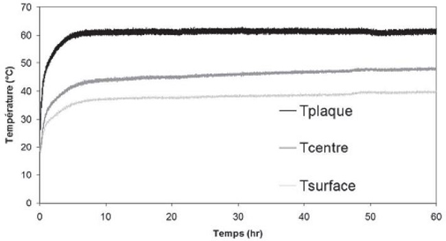 Des profils des températures lors d'une expérience de séchage sous vide à 60 °C, sont exposés dans la (Fig. 4). Une diminution de la pression permet d'atteindre le point d´ébullition de l´eau à basse température. Car le vide permet de sécher ces matériaux qui d'ordinaire n'acceptent pas de hautes températures. Durant le séchage sous vide, nous sommes en présence d'un faible taux d'oxygène. Nous pouvons donc dire aux vues des premiers résultats que les réactions d'oxydation peuvent être réduites dans ces conditions de séchage et la modification de la couleur du bois par la chaleur peut s'expliquer principalement par la production et/ou la destruction des groupes chromophores par effet thermique.