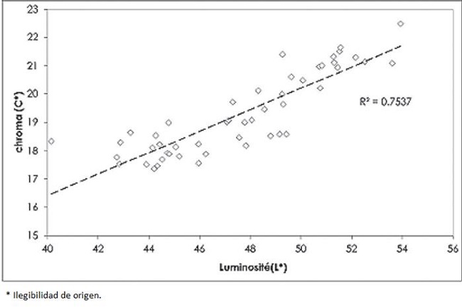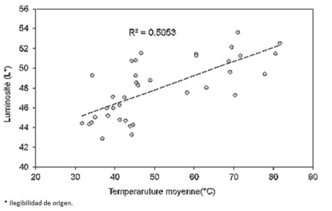La Figure 5 montre que la luminosité et la saturation de la couleur du bois sont proportionnelles. L'augmentation de la saturation et de la luminosité peuvent être liées à la dégradation thermique des extractibles (ellagitanins principalement). La luminosité peut être expliquée par une perte en composés phénoliques. La chaleur aussi peut modifier directement la couleur du bois en provoquant l'hydrolyse et l'oxydation de composants en bois. En autre, la discoloration des chênes a été étudié par Kollman, Keywerth et Kubler, (1951), et Wassipaul et Fellner, (1987), ils ont constaté qu'une humidité au-dessus de 70% facilite l'apparition des discolorations.