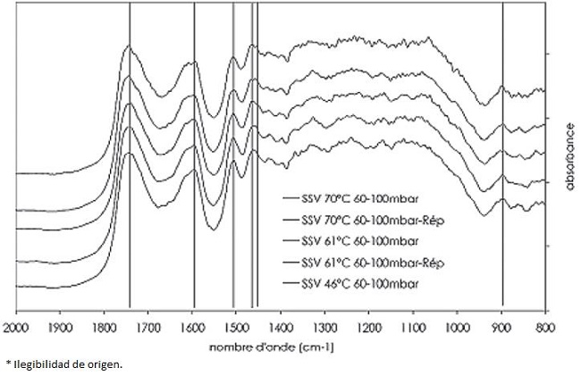 Par rapport à la technique de spectroscopie infrarouge, nous avons mesuré l'intensité des bandes à 1740 cm-1/1750 cm-1, et le rapport existant avec les potentiels antioxydants et les paramètres de l'espace CIELab. Le pic 1740 cm-1/1750 cm-1 est mis en relation avec la formation de composants chromophores C=O liés à l'oxydation des structures phénoliques (Zahri et al., 2007). Dans la Figure 6 nous présentons les spectres infrarouges du chêne lors du séchage sous vide à plaques.